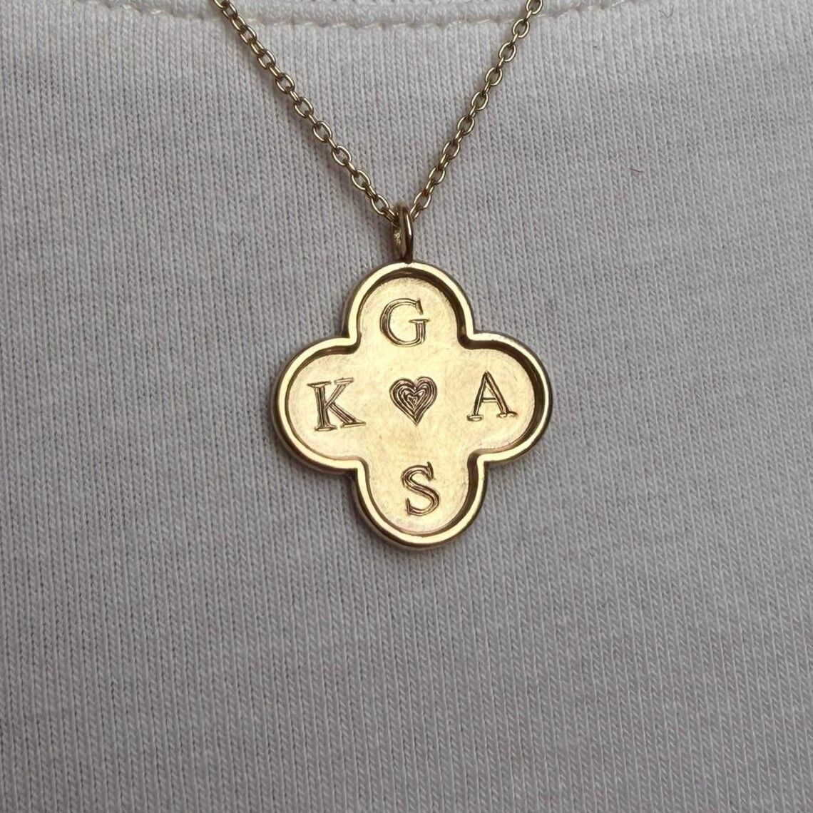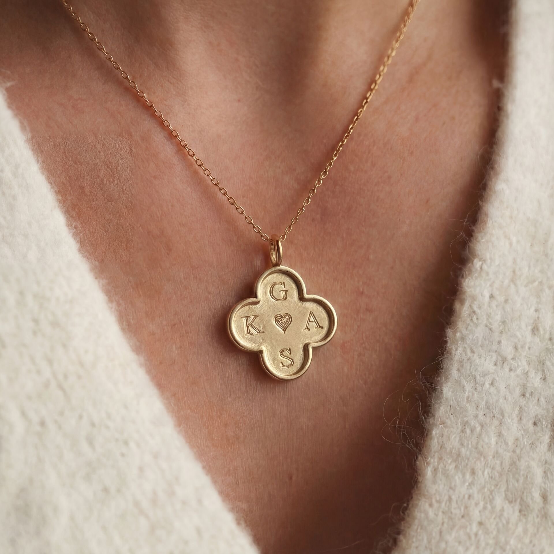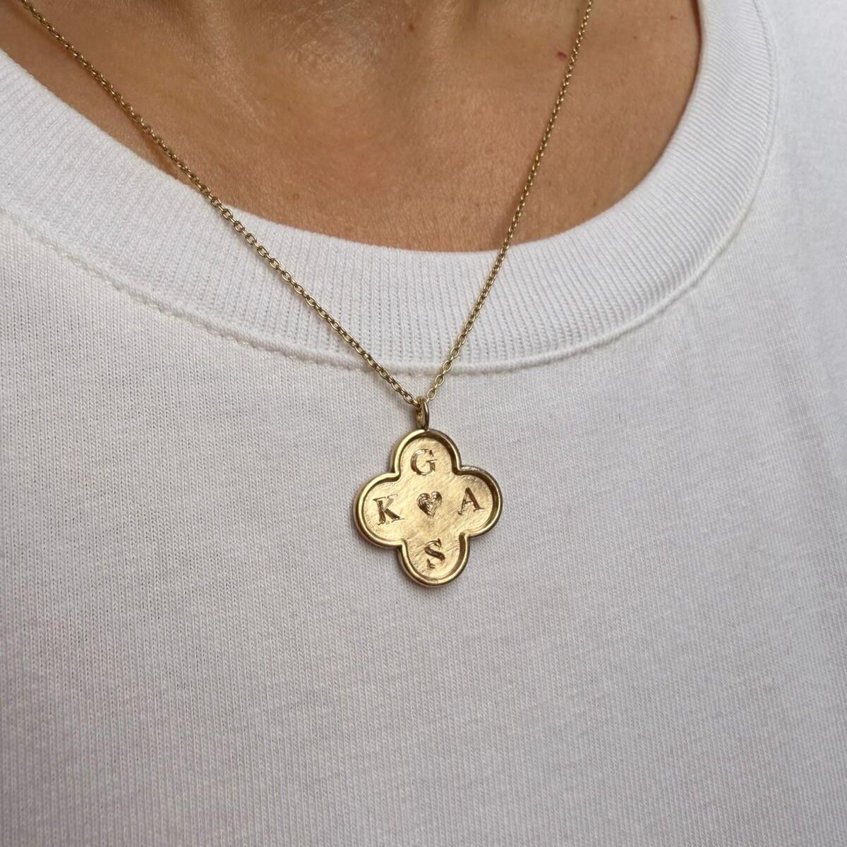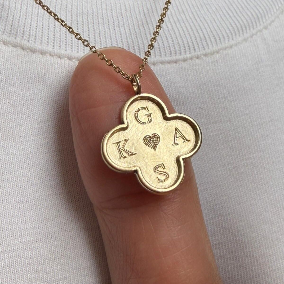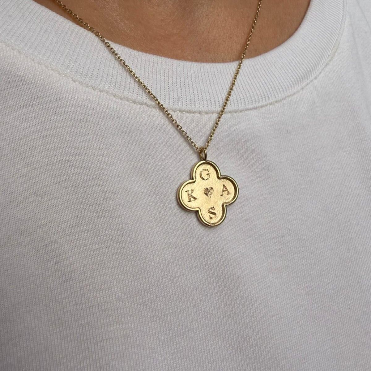 Dört yapraklı yonca formunda tasarlanan bu özel kolye, geleneksel kalemkâr işçiliği ile titizlikle hazırlanmıştır. Kolyenin her bir yaprağına 4 harfe kadar kişiye özel kazıma yapılabilir.