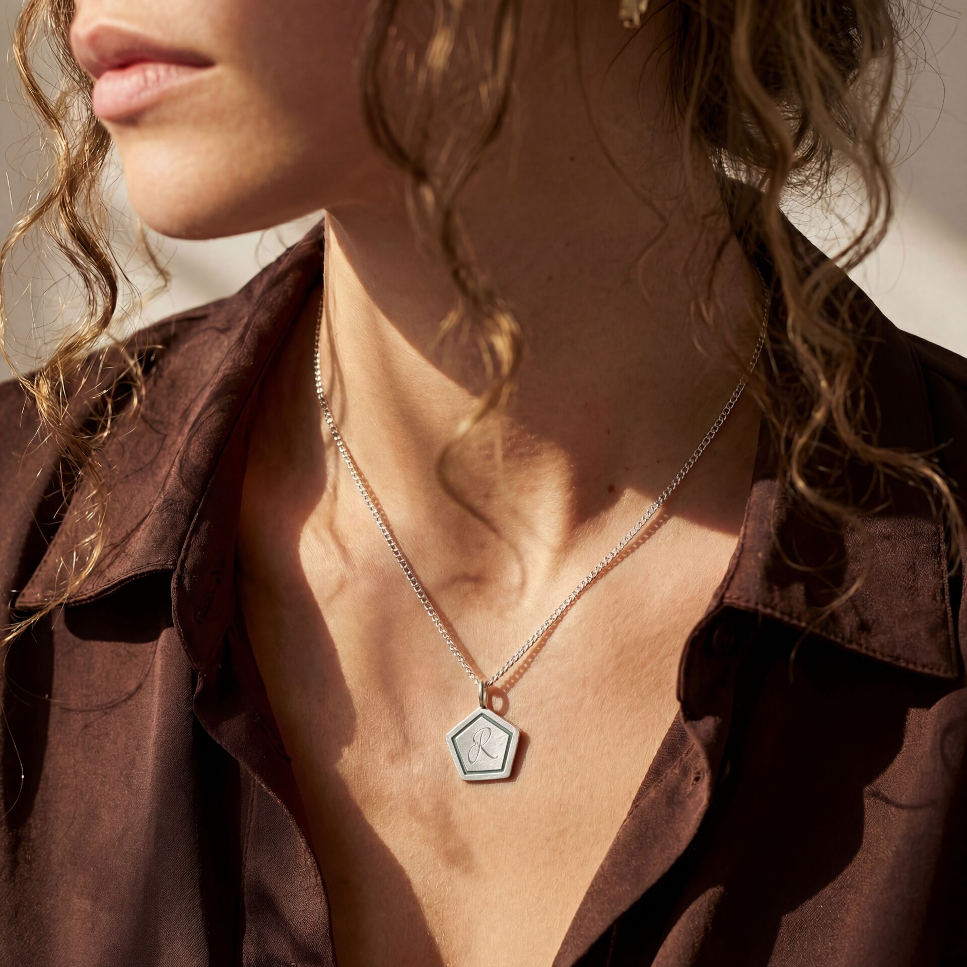 Zarif tasarımı ve kişisel dokunuşu bir araya getiren bu özel kolye, 925 ayar gümüşten üretilmiştir. Altıgen formundaki kolye ucu, kenarlarında yer alan mine uygulamasıyla dikkat çekerken, merkezde el işçiliğiyle yazılan harf tasarımıyla tamamen kişiselleştirilebilir.