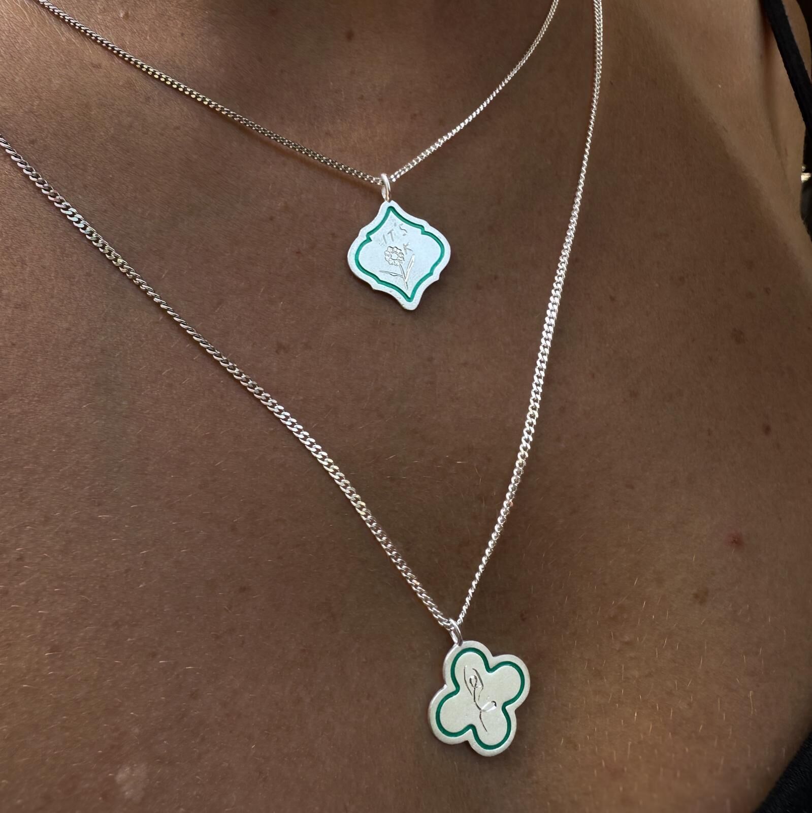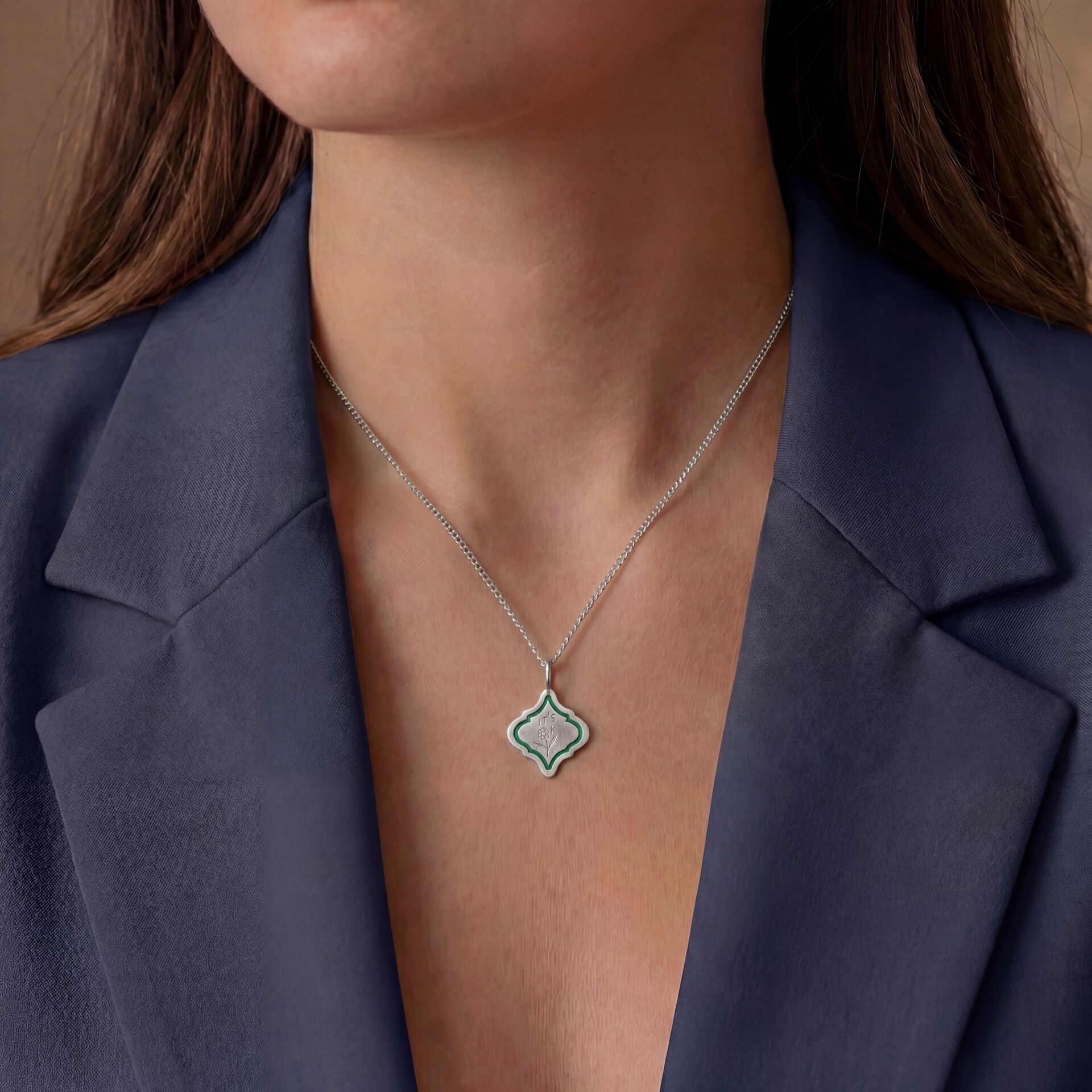 El işçiliğiyle hazırlanan bu kolye, kenarlarında yer alan mine detayı sayesinde modern bir dokunuş kazanıyor. Dilerseniz mine rengini seçerek tamamen size özel bir hale getirebilirsiniz.