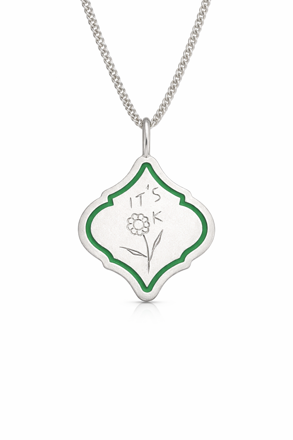 Gümüş üzerine özenle işlenmiş “It’s Ok” yazısı, çiçek motifi ile birleşerek umudu, dinginliği ve zarafeti taşıyor.