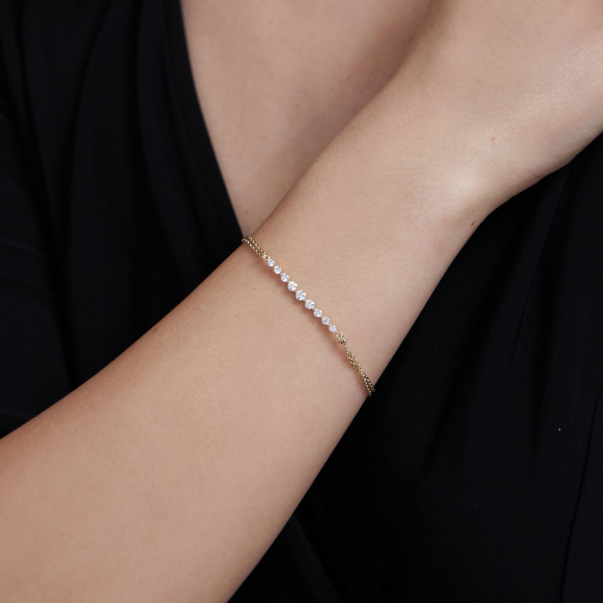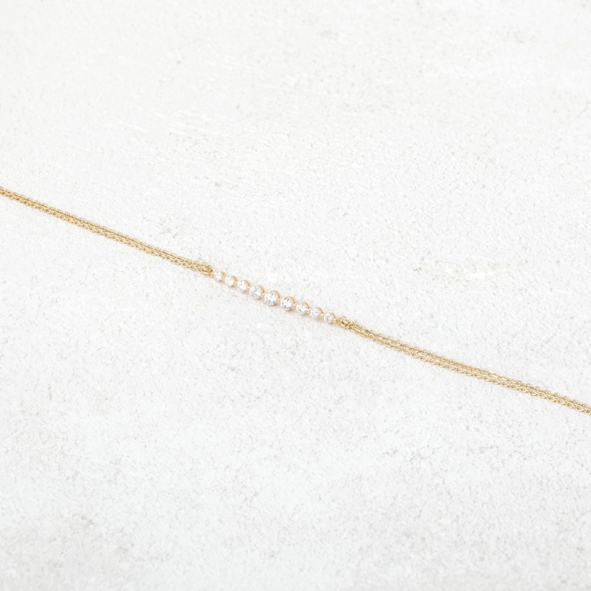 Sadeliğin gücü, detaylardaki incelikle buluşuyor. Lal bileklik; ince, zarif ama etkileyici duruşuyla öne çıkan; çift sıra altın zincirle tamamlanmış özel bir tasarımdır. Toplam 0.59 ct natürel pırlanta ışıltısı sayesinde minimal ama fark edilir bir şıklık sunar. Günlük kullanımda zarafetiyle dikkat çekerken, özel anlarda da şıklığınızın tamamlayıcısı olur. İsteğe bağlı olarak Swarovski taş alternatifiyle daha ulaşılabilir bir seçeneğe de sahiptir.