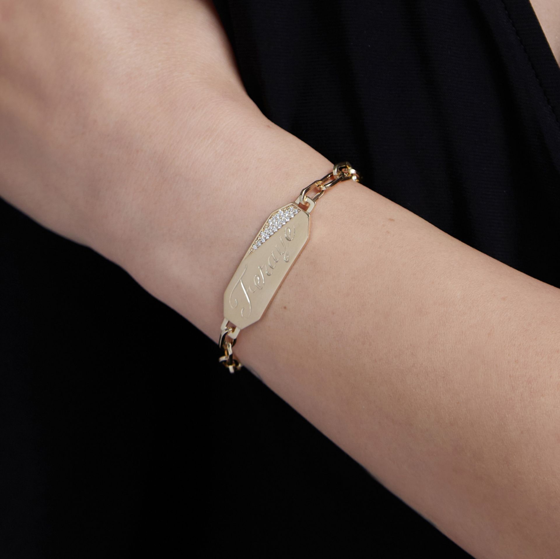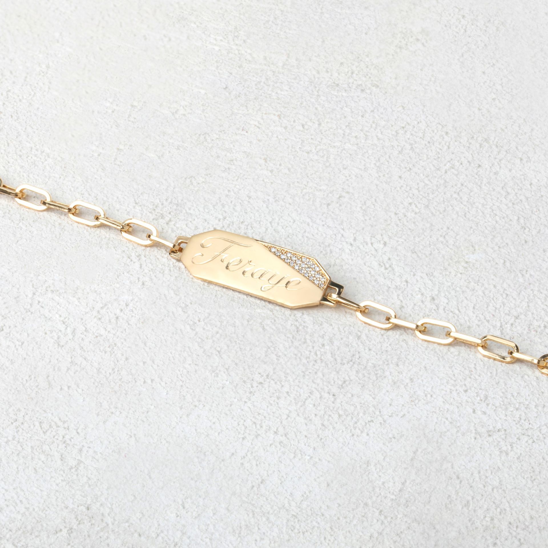 Bu özel tasarım bileklik, kişisel bir dokunuşla adınızı taşıyor. Kalemkar işçiliğiyle ustalıkla isim yazdırabileceğiniz, plaka formundaki tasarımı ve pırlanta detayları ile özenle hazırlanmaktadır. Bu bileklik, özel günlerde veya günlük hayatta size eşlik ederek, her zaman sizi özel hissettirecek ve tarzınızı tamamlayacaktır.