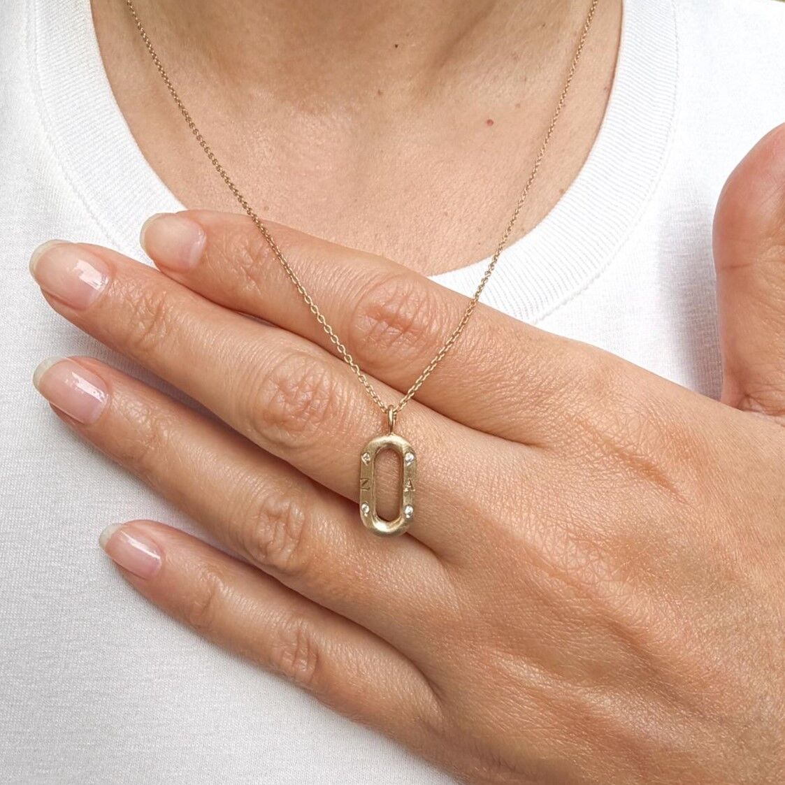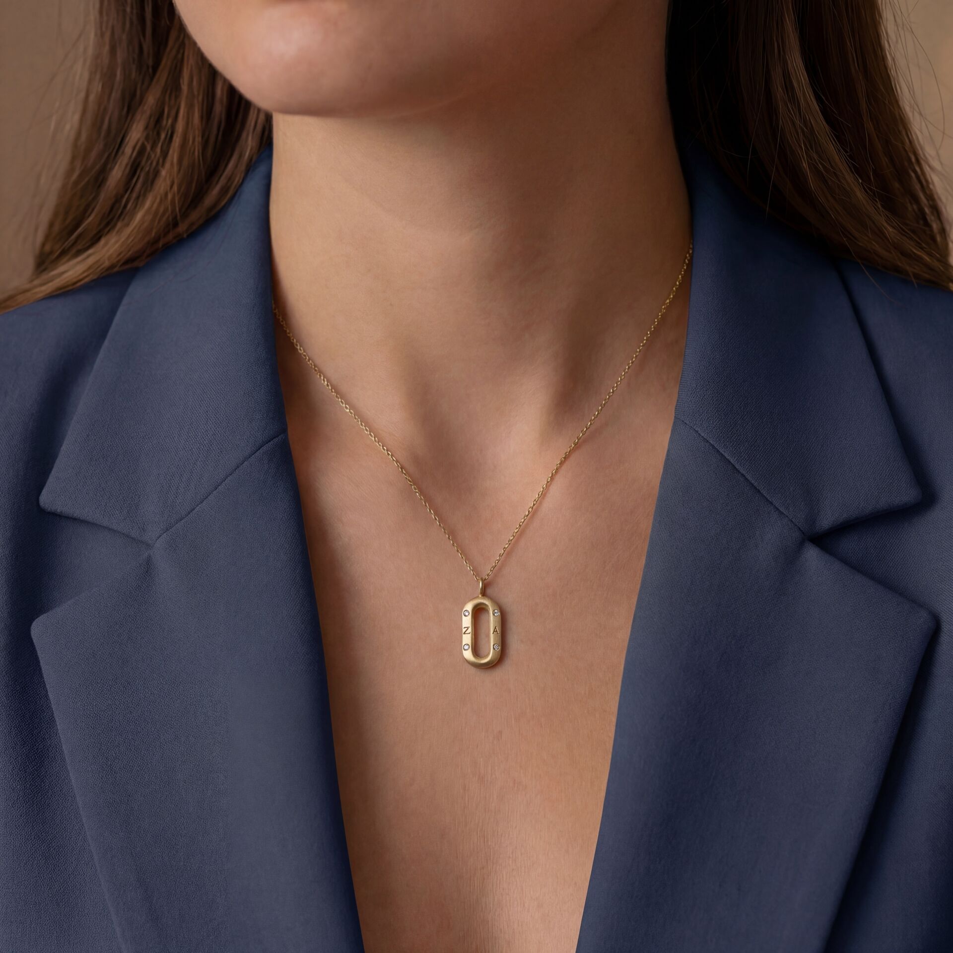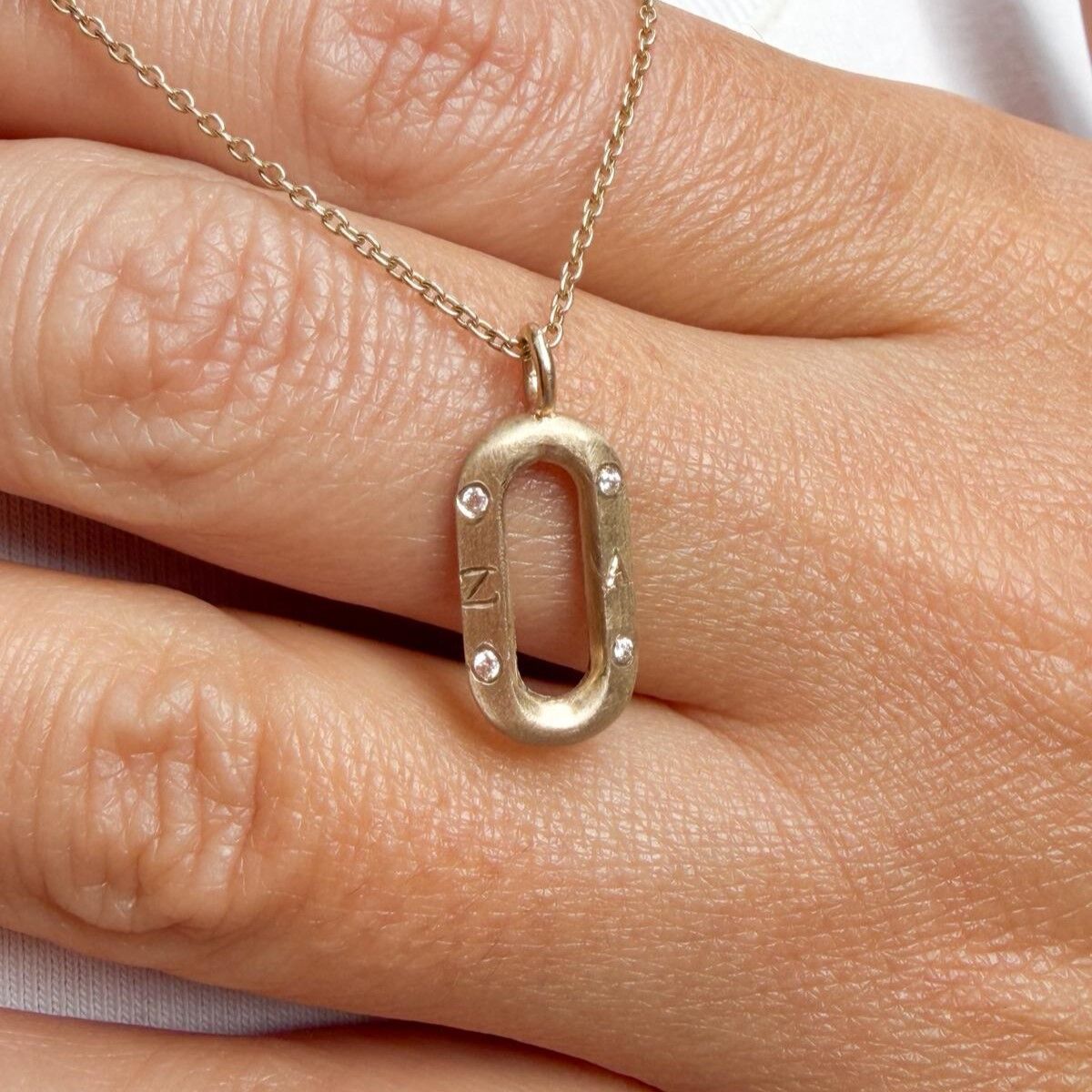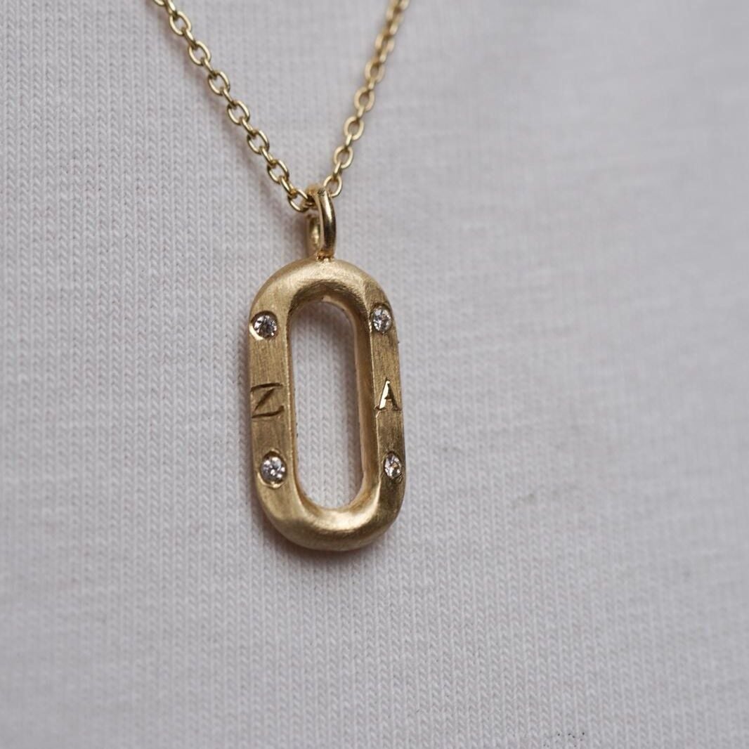 Modern ataç formundan ilham alınarak tasarlanan bu özel kolye, mat dokulu yüzeyi ve köşelerindeki zarif taş detaylarıyla güçlü ama minimalist bir görünüm sunar.