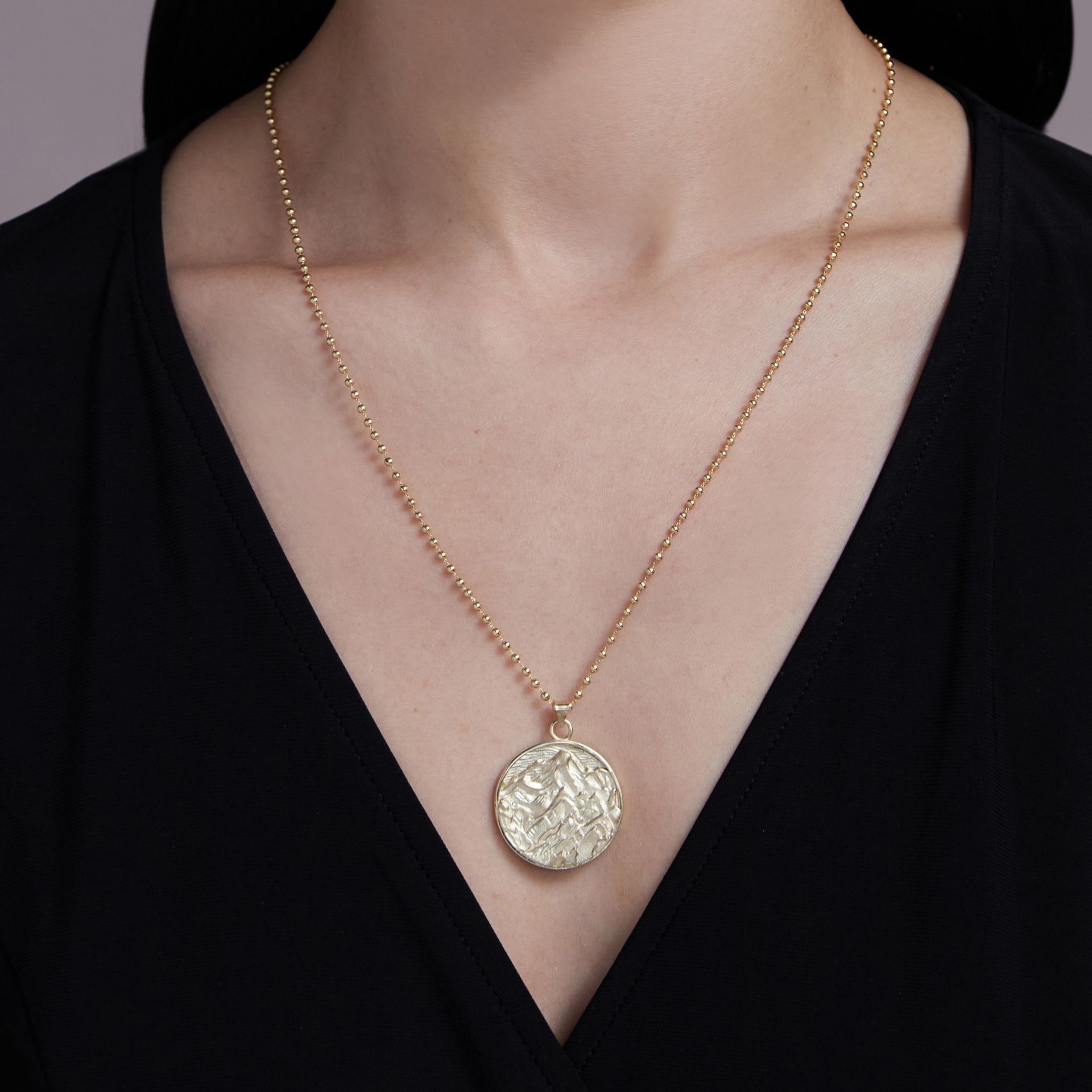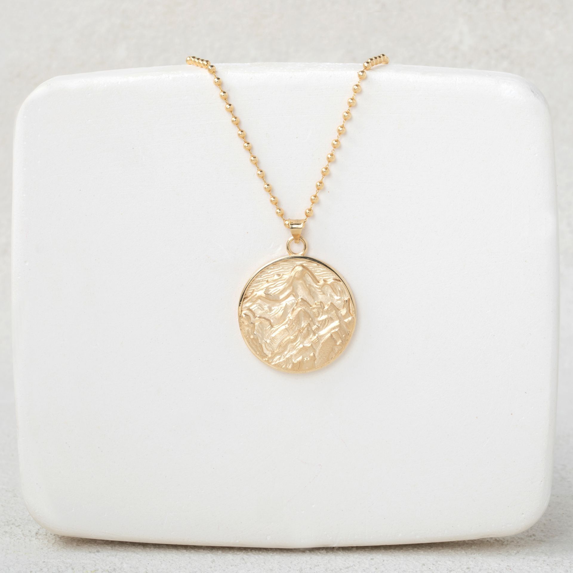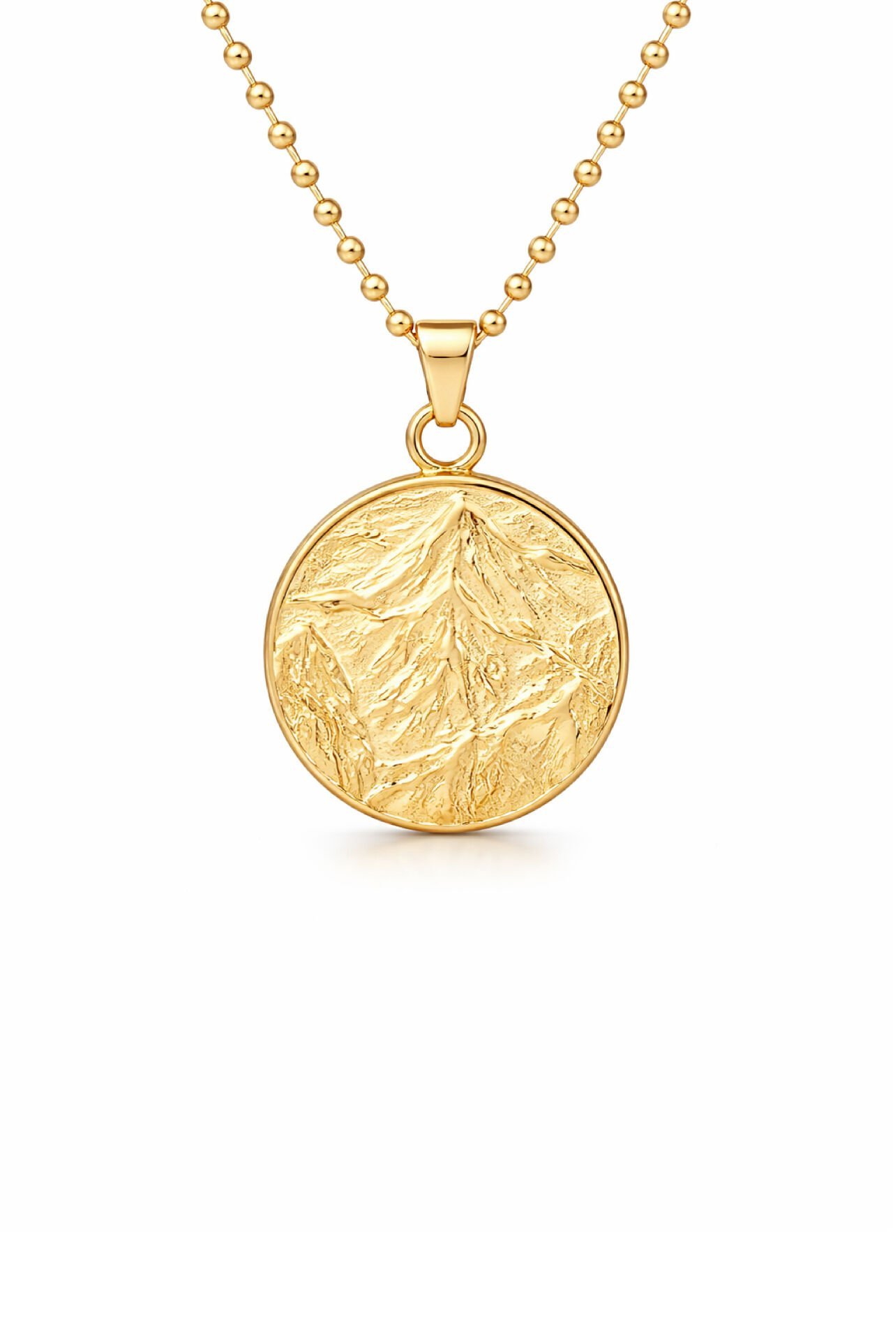 Doğanın gücünden ilham alan bu zarif kolye, 14 ayar altın dağ silüeti detayına sahip yuvarlak madalyon ucu ile hem sade hem etkileyici bir görünüm sunar. 50 cm uzunluğundaki zinciri ile günlük şıklık veya özel davetlerde zarafet için ideal bir tamamlayıcıdır. Dağların sembolize ettiği özgürlük, güç ve kararlılığı teninize taşıyın.